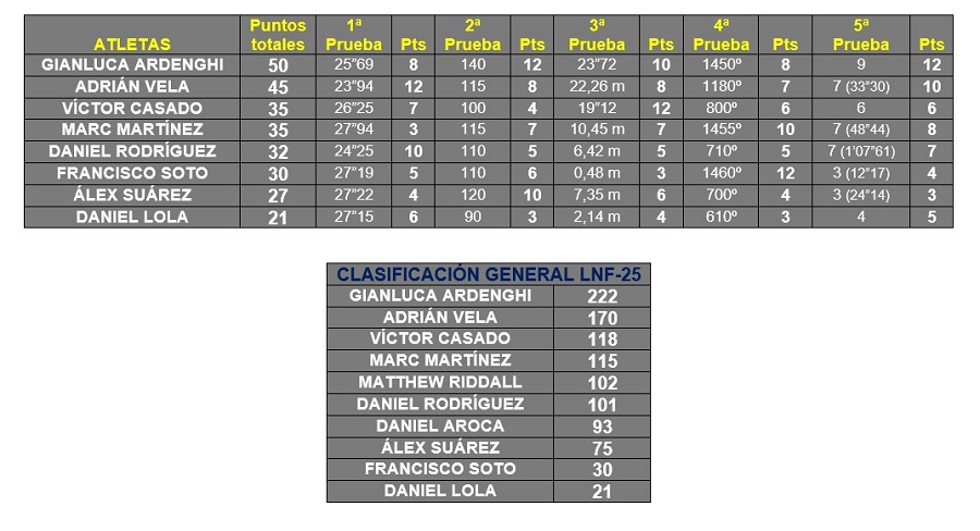 Estas son las marcas registradas y la puntuación final del Torneo, así como la Clasificación final de la Liga Nacional de Fuerza 2025.