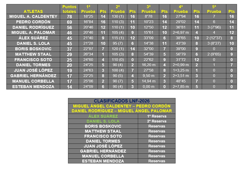 En unos días se anunciarán las fechas y lugares de los cuatro torneos de la Liga Nacional de Fuerza 2026, que disputarán los cuatro primeros clasificados en el Torneo Preliminar junto a los cuatro clasificados del pasado año, tras la baja de Víctor Casado, para conformar los ocho atletas de élite y disputar los cuatro torneos oficiales de 2026. Los ya clasificados son Gianluca Ardenghi, campeón 2025, Adrián Vela, subcampeón, Marc Martínez, cuarto y Matthew Riddall, quinto. Se unen Miguel Ángel Caldentey, Pedro Cordón, Daniel Rodríguez y Miguel Ángel Palomar. Los primeros cinco reservas para sustituir a algún lesionado o ausente a lo largo del año serán Álex Suárez, Daniel Lola, Boris Boskovic, el malagueño Matthew Staal y el sevillano Francisco Soto.