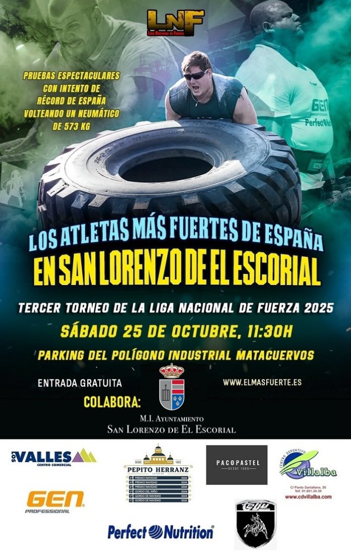 Llega el Tercer Torneo de la Liga Nacional de Fuerza 2025. Se celebra el próximo sábado 25 de octubre a partir de las 11:30 en el Parking del Polígono Industrial Matacuervos (al lado del Polideportivo El Zaburdón) de San Lorenzo de El Escorial (Madrid). Además de las duras pruebas habituales de esta tremenda competición, en la quinta y última los atletas tendrán la posibilidad de batir el récord de España de Volteo de Neumático. La rueda pesa 573 kg y el mejor registro hasta la fecha ha sido el conseguido por el gallego Roberto Rodríguez, pentacampeón de la Liga Nacional de Fuerza, que lo volteó en noviembre de 2020 en una ocasión, con un tiempo de 16 segundos y 80 centésimas, mientras que consiguió dos vueltas en un tiempo de 50 segundos y 30 centésimas.
